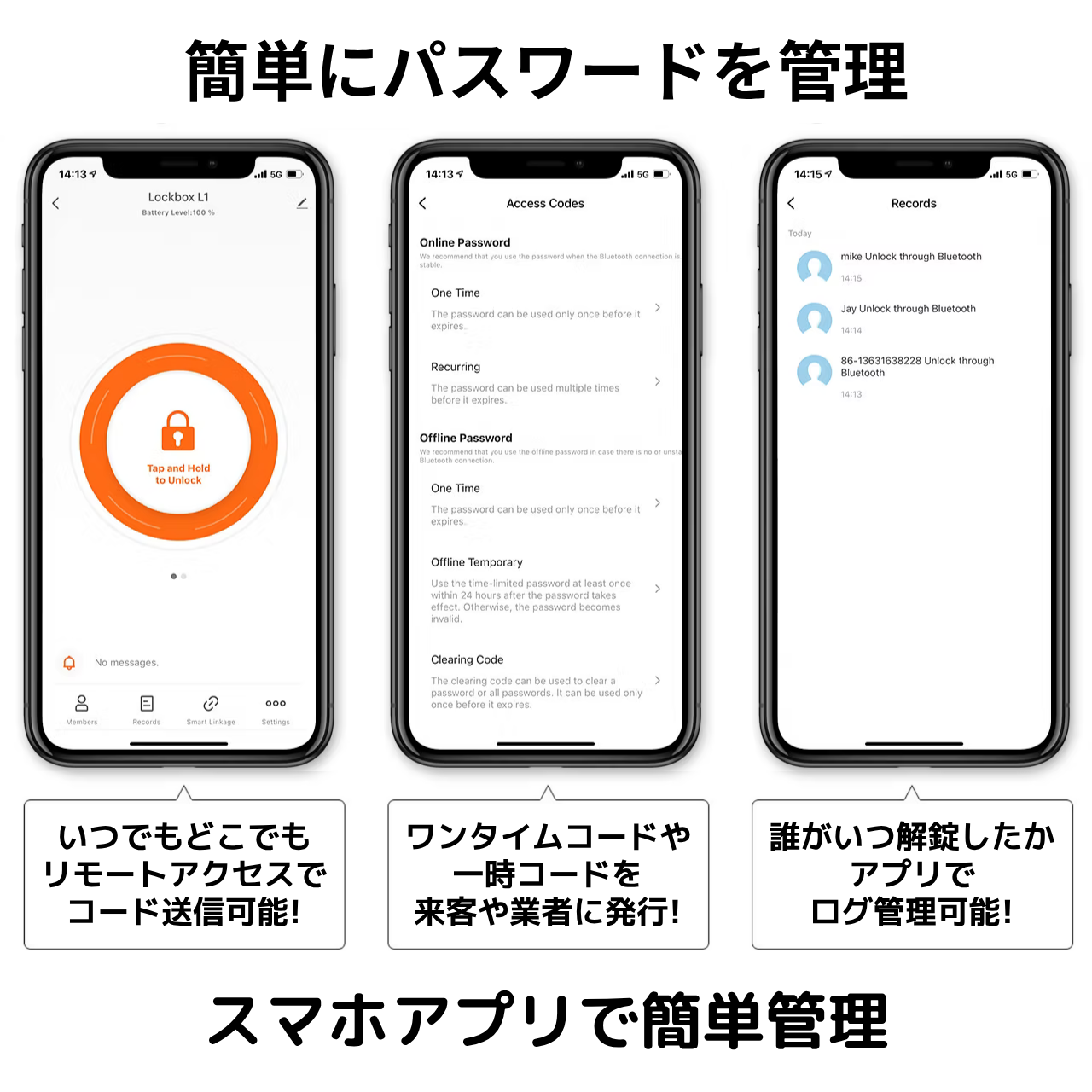 ● 解錠方法:専用アプリ(Bluetooth)、暗証番号(6桁〜10桁:専用アプリで発行)